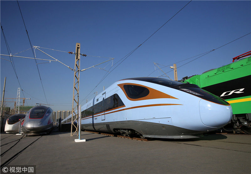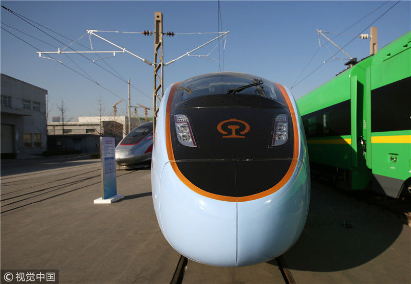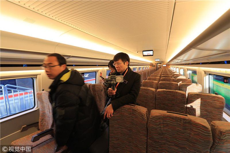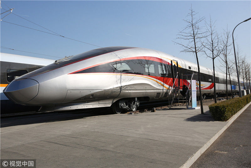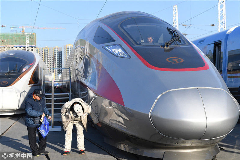 2018年12月24日,北京,中國(guó)鐵路科技創(chuàng)新成果展在國(guó)家鐵道試驗(yàn)中心舉行。新型復(fù)興號(hào)動(dòng)車(chē)組實(shí)車(chē)首次公開(kāi)亮相,現(xiàn)場(chǎng)體驗(yàn)乘車(chē)運(yùn)行。視覺(jué)中國(guó)