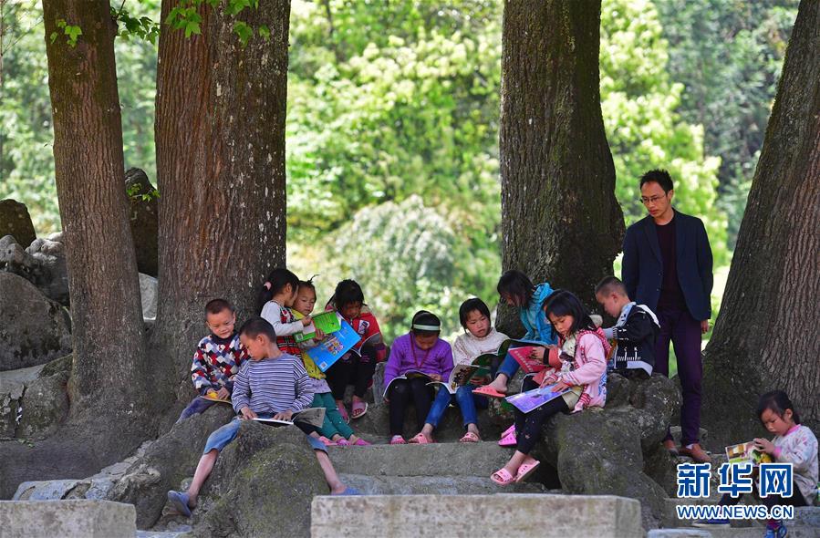 烏英教學(xué)點(diǎn)的孩子們?cè)诖髽?shù)下學(xué)習(xí)(4月17日攝)。