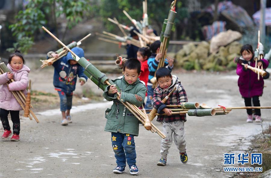 孩子們?cè)诎徇\(yùn)剛剛購(gòu)買(mǎi)的蘆笙(12月24日攝)。