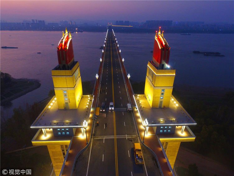 2018年12月13日,江蘇南京,“一橋飛架南北,天塹變通途?!弊鳛槲覈?guó)第一座自行設(shè)計(jì)和建造的雙層鐵路、公路兩用橋,南京長(zhǎng)江大橋在我國(guó)橋梁史上的重要地位不言而喻。從1968年建成后的48年間,它就如同一條巨龍,始終在長(zhǎng)江上默默守護(hù)著人來(lái)車(chē)往。南京長(zhǎng)江大橋上層是公路橋,下層為雙軌復(fù)線(xiàn)鐵路橋,連接津浦鐵路與滬寧鐵路干線(xiàn),是我國(guó)南北交通要津和命脈。近年來(lái),由于南京長(zhǎng)江大橋公路橋的實(shí)際通行荷載遠(yuǎn)超原先設(shè)計(jì)標(biāo)準(zhǔn),不僅橋面上擁堵?,F(xiàn),橋梁本身的種種“病害”也日益加深。圖為2018年12月13日,夜幕降臨,南京長(zhǎng)江大橋歸位后的玉蘭花燈重新點(diǎn)亮。大橋玉蘭花燈柱共有299根,每根燈柱上有5盞玉蘭花燈,1大4小,一共1495盞。方東旭/視覺(jué)中國(guó)