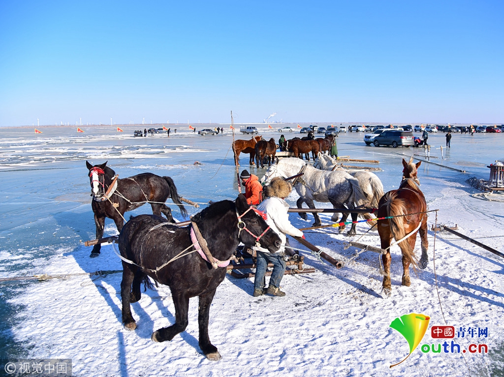 2018年11月25日,黑龍江省哈爾濱市,松花江封江不久,已經(jīng)有人蹬江鑿冰下網(wǎng)捕魚(yú)。 圖片來(lái)源:視覺(jué)中國(guó)