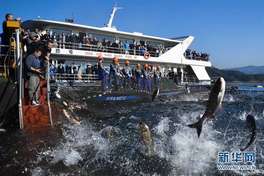 11月28日,游客在千島湖觀看巨網(wǎng)捕魚。 新華社記者黃宗治攝