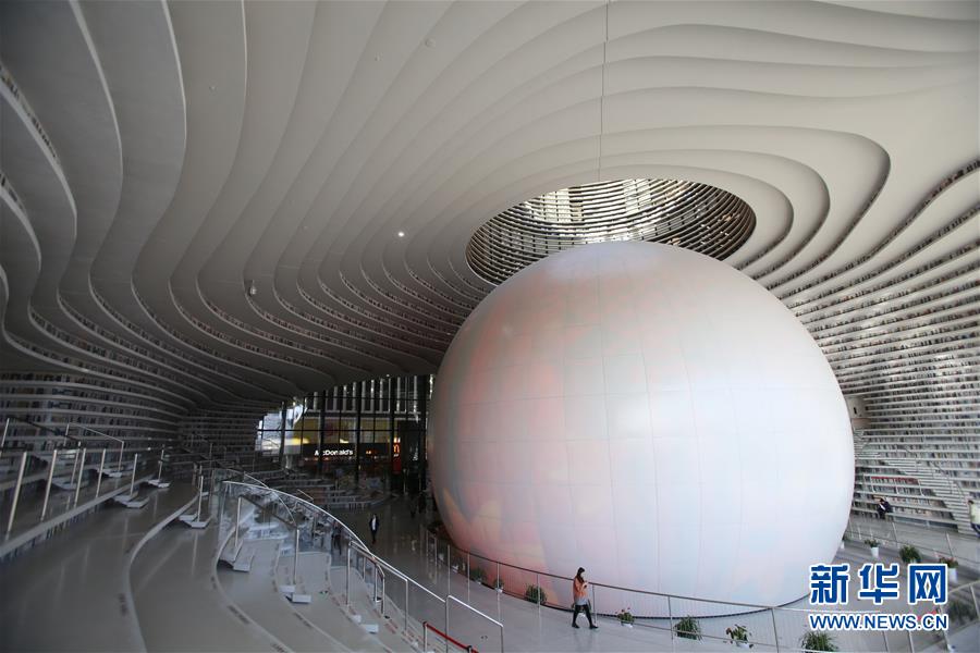 這是12月27日拍攝的天津?yàn)I海新區(qū)圖書館中庭。 濱海新區(qū)圖書館位于天津?yàn)I海文化中心,2017年10月1日正式開館,設(shè)計(jì)立意為“濱海之眼”和“書山有路勤為徑”。圖書館現(xiàn)有藏書60多萬冊(cè),一年多來接待讀者約280萬人次,已成為濱海新區(qū)的文化“新地標(biāo)”。 新華社記者李然攝