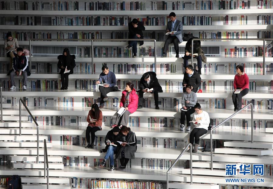 12月27日,讀者參觀天津?yàn)I海新區(qū)圖書館中庭。 濱海新區(qū)圖書館位于天津?yàn)I海文化中心,2017年10月1日正式開館,設(shè)計(jì)立意為“濱海之眼”和“書山有路勤為徑”。圖書館現(xiàn)有藏書60多萬冊(cè),一年多來接待讀者約280萬人次,已成為濱海新區(qū)的文化“新地標(biāo)”。 新華社記者段卓力攝