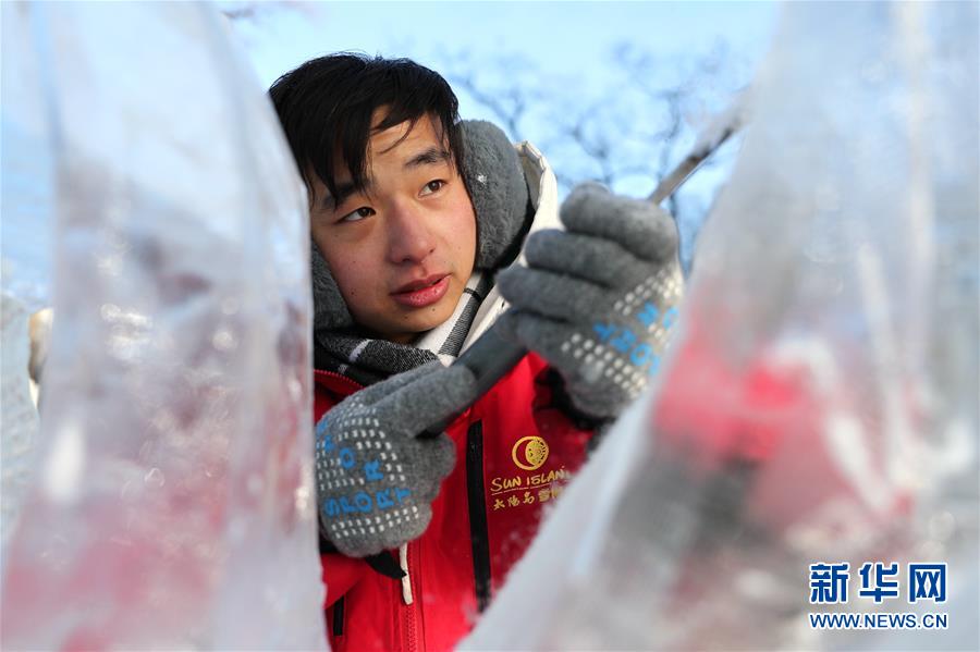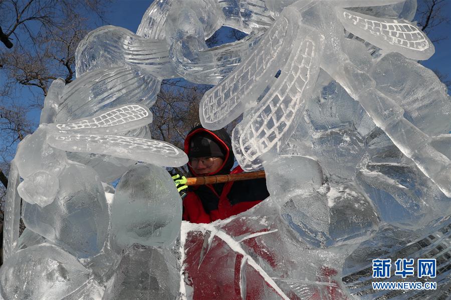12月27日,選手們?cè)诒荣愔型晟票褡髌贰?當(dāng)日,第十六屆黑龍江省大學(xué)生冰雕藝術(shù)設(shè)計(jì)創(chuàng)作大賽在哈爾濱兆麟公園落下帷幕,全省高校共有99支隊(duì)伍參賽。 新華社記者曹霽陽(yáng)攝