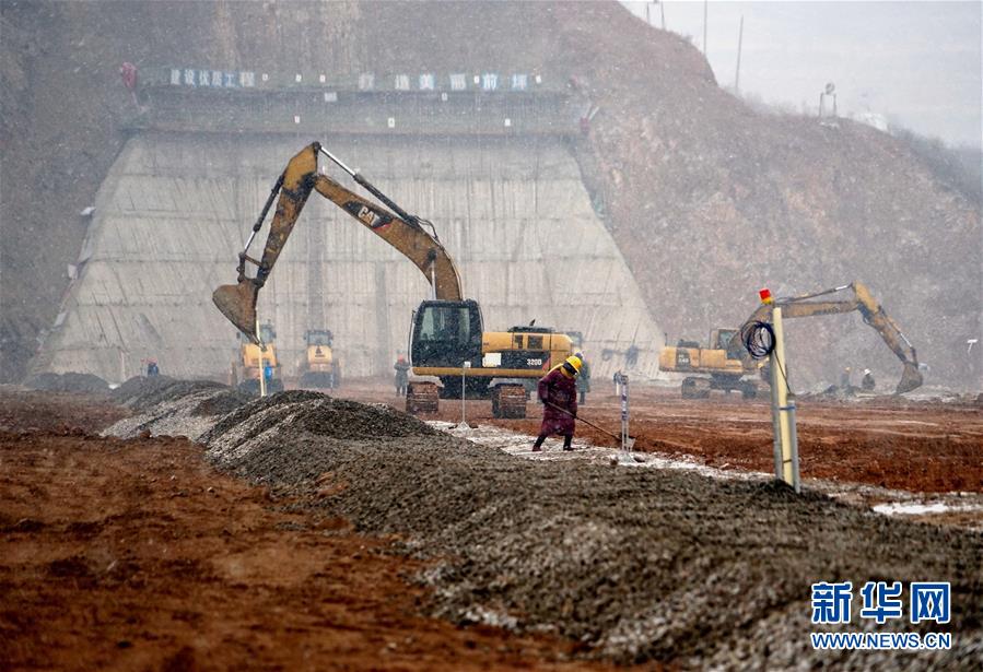 12月27日,工作人員和大型機械在前坪水庫大壩上施工。目前,被國務(wù)院列為172項節(jié)水供水重大水利工程之一的前坪水庫主體工程建設(shè)進度已超八成。該水庫位于河南省汝陽縣前坪村,是一座以防洪為主,兼具供水、灌溉、發(fā)電功能的大型水利樞紐工程。新華社記者 李安 攝