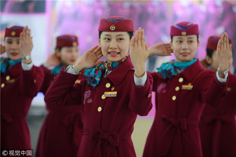 2018年12月27日,四川成都,為備戰(zhàn)即將開通的成雅鐵路,中國鐵路成都局集團有限公司成都客運段動車二隊對成雅動車的乘務人員進行理論、形體、服務禮儀等內容的培訓。