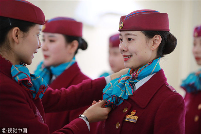 2018年12月27日,四川成都,為備戰(zhàn)即將開通的成雅鐵路,中國鐵路成都局集團有限公司成都客運段動車二隊對成雅動車的乘務人員進行理論、形體、服務禮儀等內(nèi)容的培訓。蘇志剛/視覺中國