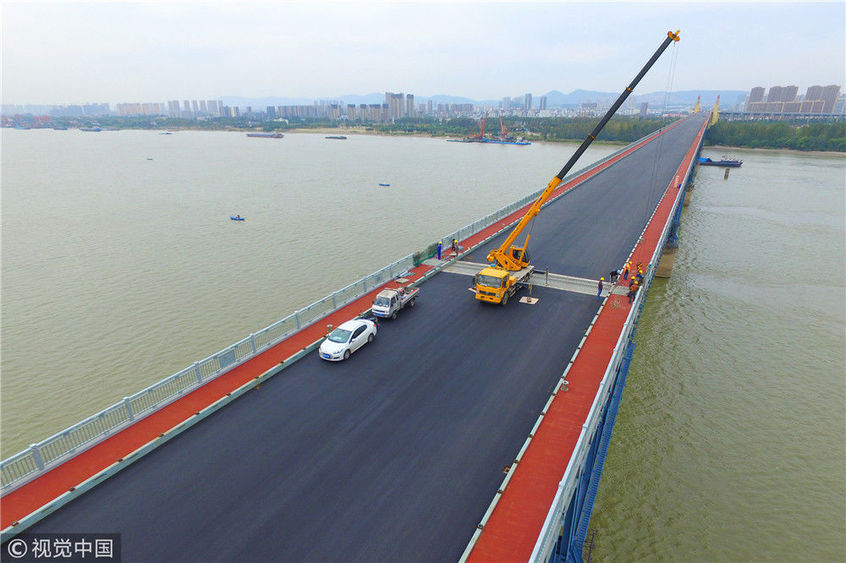 2018年10月19日,南京長(zhǎng)江大橋主橋橋面鋪上瀝青,一輛吊車在南京長(zhǎng)江大橋上作業(yè)。