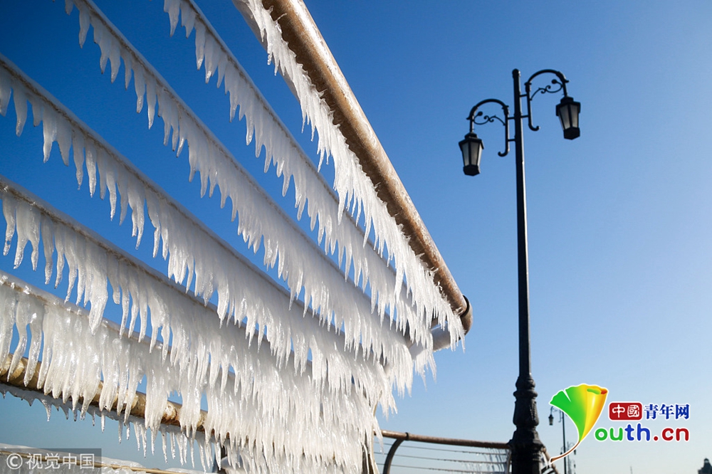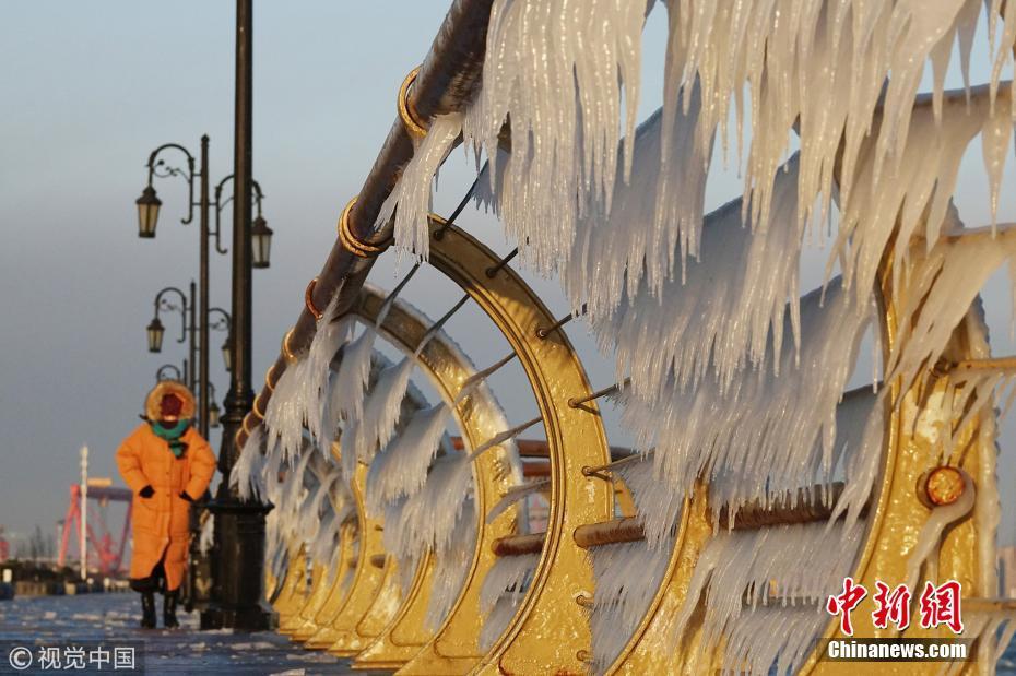 渤海海水在北風(fēng)的作用下涌向岸邊,在大連東港海岸護(hù)欄上凝結(jié)成冰凌,形成約有兩公里的冰凌奇觀。圖為大連市東港海岸護(hù)欄結(jié)滿晶瑩剔透的冰棱。圖片來(lái)源:視覺(jué)中國(guó)