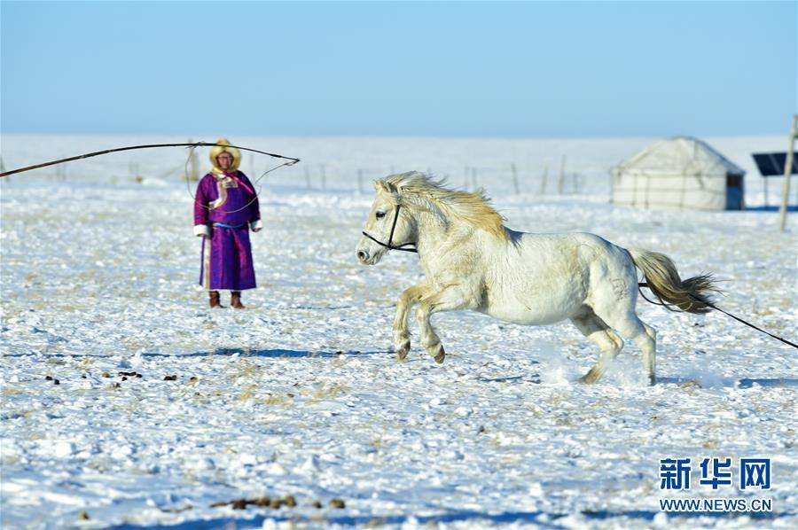 1月8日,牧民進(jìn)行套馬表演。 時(shí)下正值草原冬季旅游旺季,內(nèi)蒙古自治區(qū)西烏珠穆沁旗的牧民們?cè)谘┰弦徽股硎郑瑸橛慰驼宫F(xiàn)獨(dú)特的民族風(fēng)情。 新華社記者 鄒予 攝