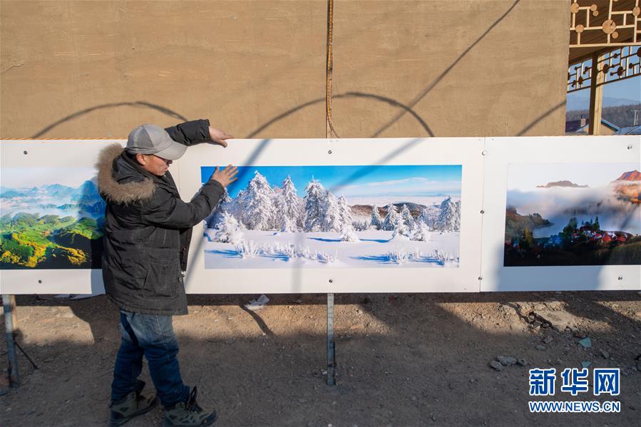 1月10日,在舒蘭市二合屯,農(nóng)民攝影師李志成將攝影作品擺放在小院內(nèi)供游客欣賞。 新華社記者張楠攝