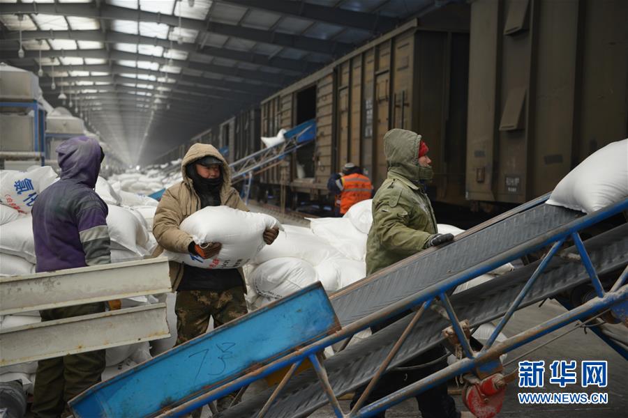 1月12日,在滿洲里鐵路口岸站裝卸二車間化肥作業(yè)場(chǎng)區(qū),工作人員將化肥放上傳送帶。 新華社記者 鄒予 攝