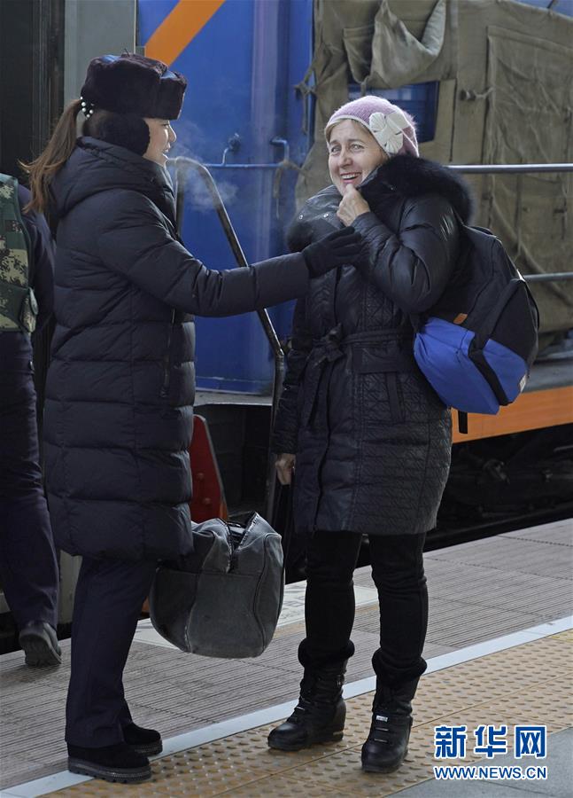 1月11日,在滿洲里火車站站臺,“金鑰匙”服務(wù)臺客運員協(xié)助外籍旅客乘車。