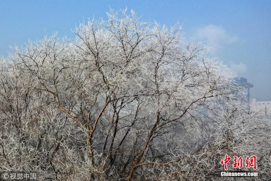 1月13日,霧散日升。河北省邢臺市大街小巷的樹枝上掛滿了潔白晶瑩的霜花,藍天下微風吹拂銀絲閃爍,奇麗壯觀。給臘八節(jié)日增添了亮麗的風景?;艏t軍 攝 圖片來源:視覺中國