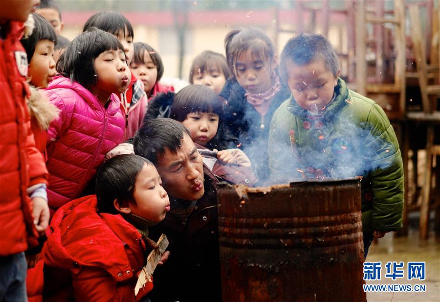 1月3日,章站亮(前右)和黃泥小學(xué)的學(xué)生們一起生火。由于生火用的材料均是廢棄的桌椅或者枯葉,點(diǎn)火后得不停地靠嘴吹氣才能燒得旺盛。