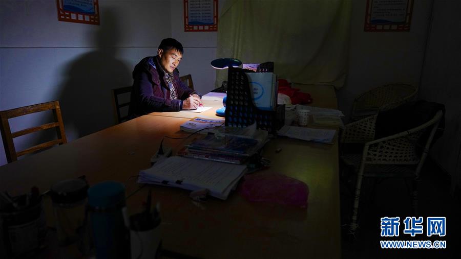 1月4日,學(xué)生們和老師都走后,章站亮在學(xué)校的辦公室內(nèi)備課。 新華社記者 胡晨歡 攝