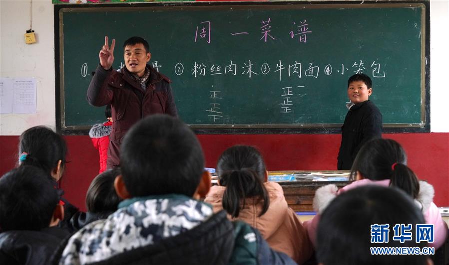 1月4日,章站亮(左)和學(xué)生們召開“每日食譜選舉會(huì)”,共同選出下次學(xué)生們想吃的餐點(diǎn)。 新華社記者 胡晨歡 攝