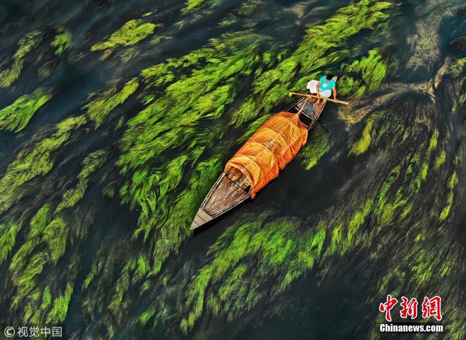 中國(guó)新聞網(wǎng)1月14日訊(具體拍攝時(shí)間不詳),孟加拉國(guó)烏拉帕拉,漁船在水流和藻類的映襯下前行,畫面看起來(lái)就像水彩畫一般。圖片來(lái)源:視覺(jué)中國(guó)
