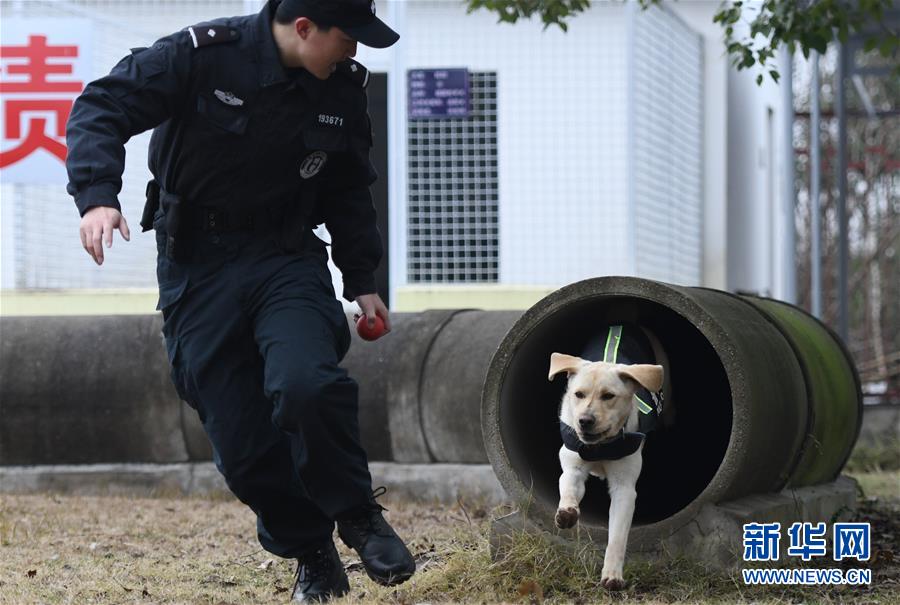 1月15日,警犬“皮特”在訓(xùn)導(dǎo)員丁巖的帶領(lǐng)下進行崗前特訓(xùn)。 新華社記者 程敏 攝