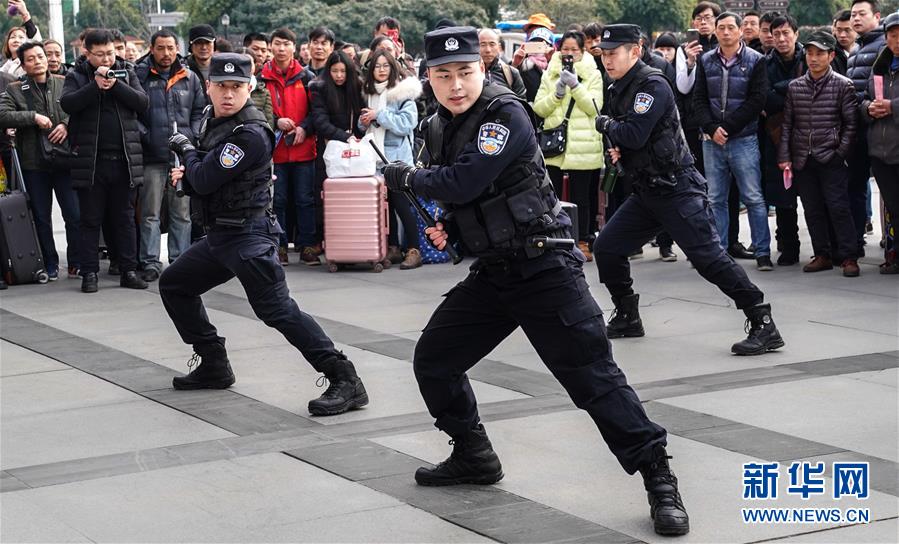 1月16日,旅客在觀看民警技能演練。 當日,武漢鐵路公安處在漢口火車站舉行警營開放日活動,讓旅客零距離接觸警務安全工作,營造良好的春運出行環(huán)境。 新華社記者程敏攝
