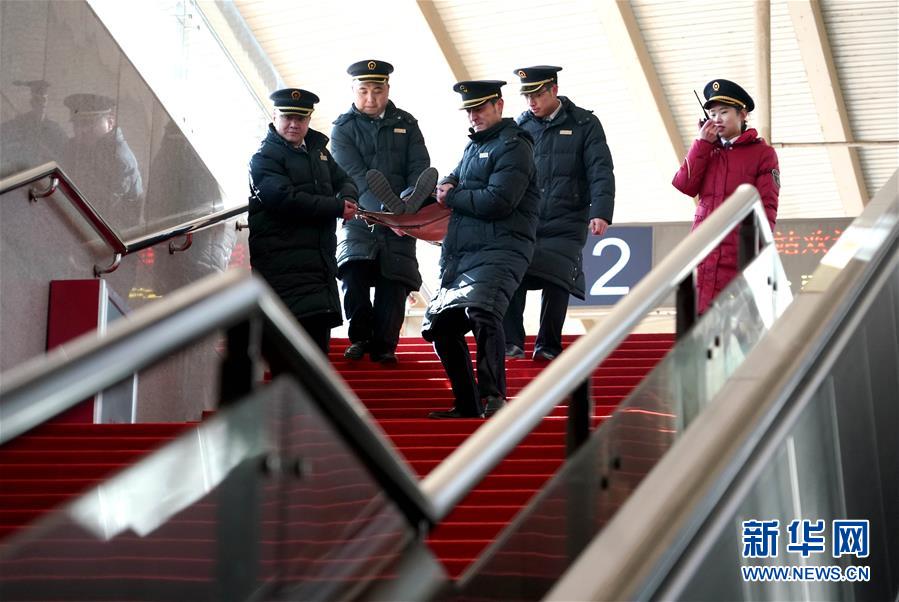 1月16日,鶴壁東站的職工在進行列車下交重傷病旅客應急演練。 當日,中國鐵路鄭州局集團有限公司新鄉(xiāng)車務段鶴壁東站組織職工開展服務禮儀、手語等業(yè)務培訓,并進行非正常情況應急演練,為2019年春運做準備。 新華社記者李安攝