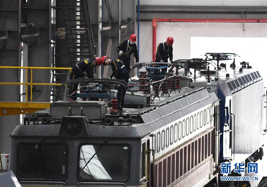 1月16日,重慶機務段職工在對機車車頂設備進行檢修。 臨近春運,為確保春運旅客和貨物列車運輸安全,中國鐵路成都局集團有限公司重慶機務段對全段機車進行專項檢查、整修,為即將到來的春運做準備。 新華社記者王全超攝
