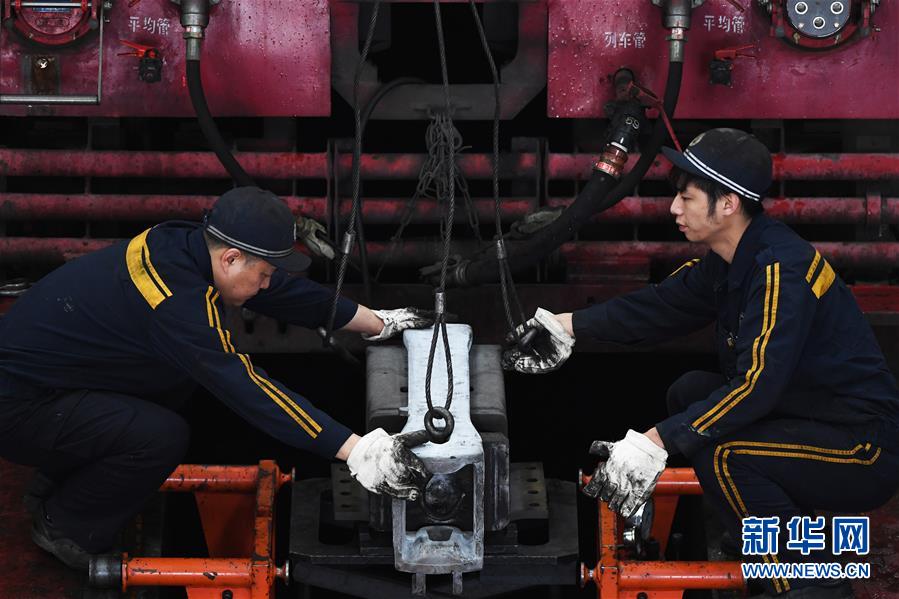 1月16日,重慶機務段職工在對機車車鉤進行檢修。 臨近春運,為確保春運旅客和貨物列車運輸安全,中國鐵路成都局集團有限公司重慶機務段對全段機車進行專項檢查、整修,為即將到來的春運做準備。 新華社記者王全超攝