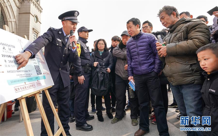 1月16日,民警講解真假火車票辨識方法。 當日,武漢鐵路公安處在漢口火車站舉行警營開放日活動,讓旅客零距離接觸警務安全工作,營造良好的春運出行環(huán)境。 新華社記者程敏攝