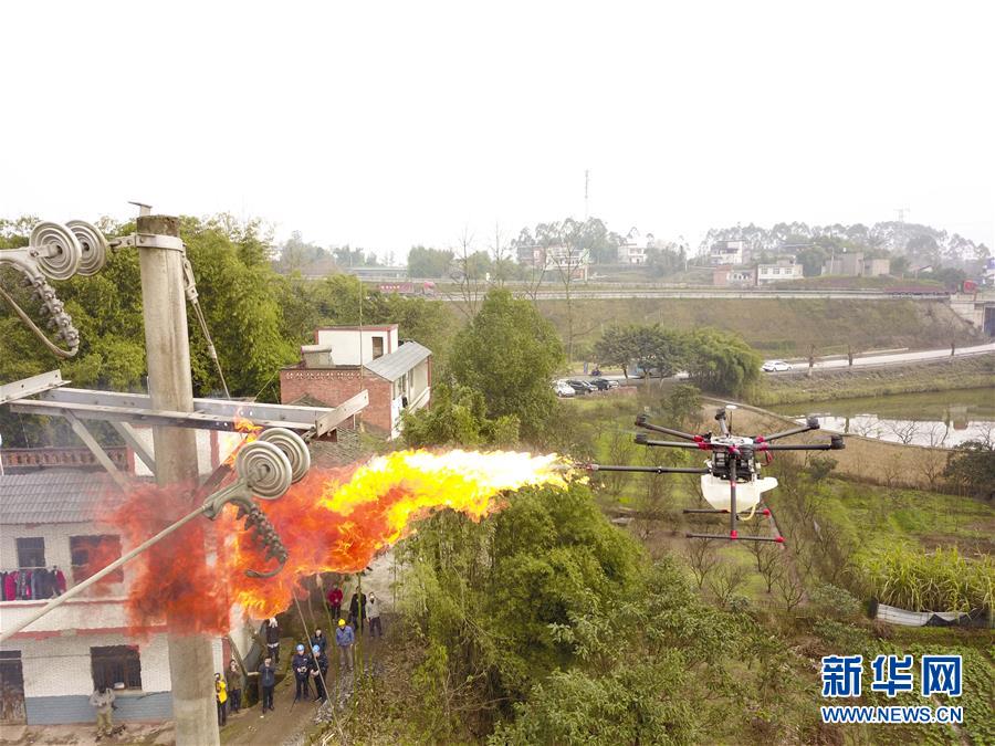 1月16日,噴火清障無人機(jī)在國網(wǎng)重慶永川供電公司無人機(jī)班兩名操作手的控制下進(jìn)行噴火清障作業(yè)演示。 1月16日,經(jīng)過3年多的研發(fā)和測試,重慶首臺(tái)噴火清障無人機(jī)在國網(wǎng)重慶永川供電公司無人機(jī)班正式投用。這臺(tái)多旋翼無人機(jī),通過搭載帶有燃料箱、油泵、自動(dòng)點(diǎn)火裝置的噴火吊艙任務(wù)模塊,可以對(duì)影響高空電力線路安全的飄掛物進(jìn)行定點(diǎn)障礙清除作業(yè)。 據(jù)噴火清障無人機(jī)研發(fā)負(fù)責(zé)人何濤介紹,過去高空清除異物主要靠人工進(jìn)行,為保證安全經(jīng)常需要停電作業(yè),因此他們結(jié)合實(shí)際工作經(jīng)驗(yàn)和高空電力線路的自身特點(diǎn),設(shè)計(jì)和制造出了噴火清障無人機(jī)。2018年測試期間,國網(wǎng)重慶永川供電公司無人機(jī)班在多種環(huán)境下成功執(zhí)行了50多次高空電力線路清障作業(yè)。 新華社記者 劉潺 攝