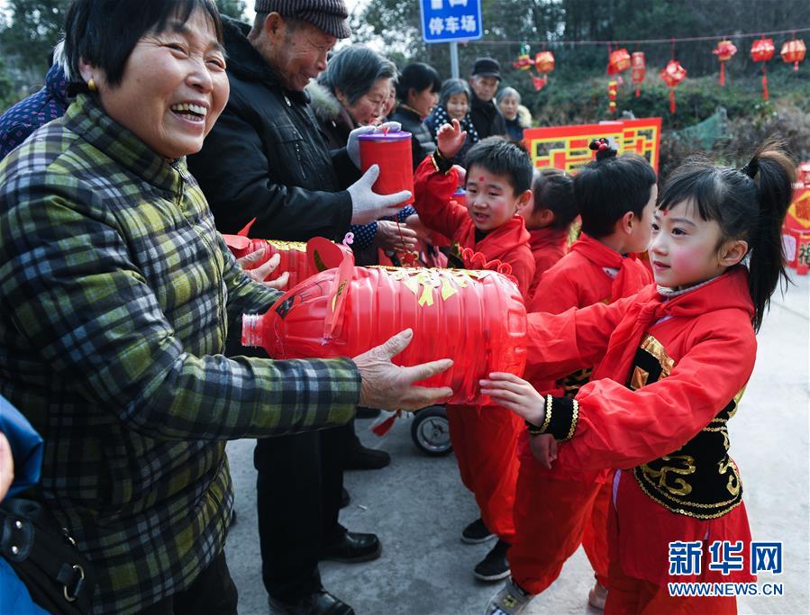 1月16日,孩子們把用廢舊物品制作的節(jié)日花燈送給村民。 臨近春節(jié),浙江省長興縣開發(fā)區(qū)中心幼兒園的老師和孩子們來到長興縣太湖街道下屬的新塘村,為村民表演文藝節(jié)目,用喜慶的傳統(tǒng)舞蹈營造節(jié)日氣氛。另外孩子們還用紙盒、瓶子、彩色包裝紙等廢舊物品制作了環(huán)?;?,送給村民,倡導低碳環(huán)保的節(jié)日新風。 新華社記者 徐昱 攝