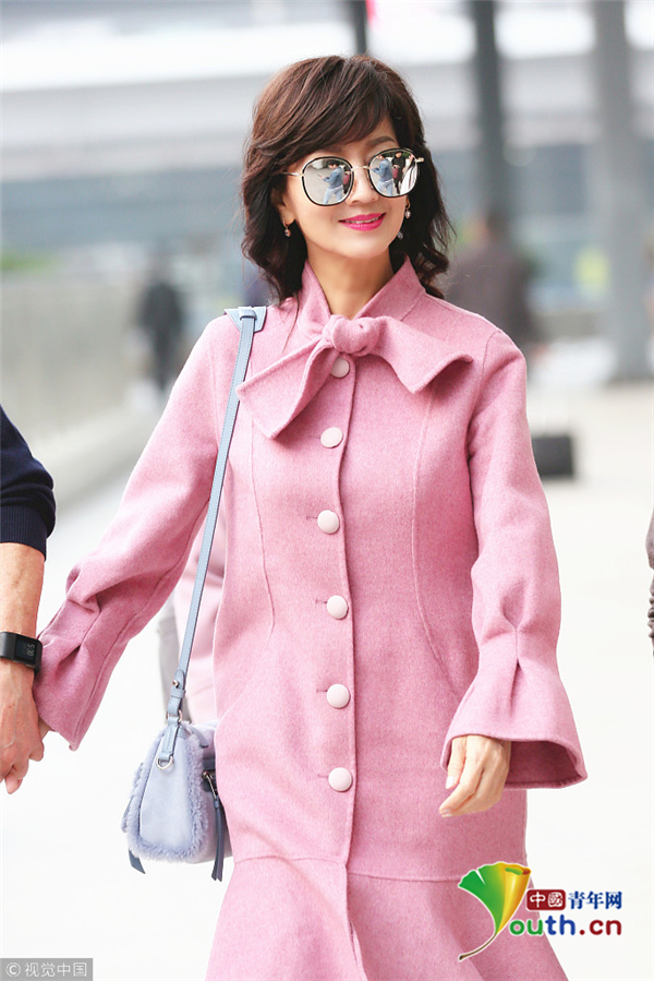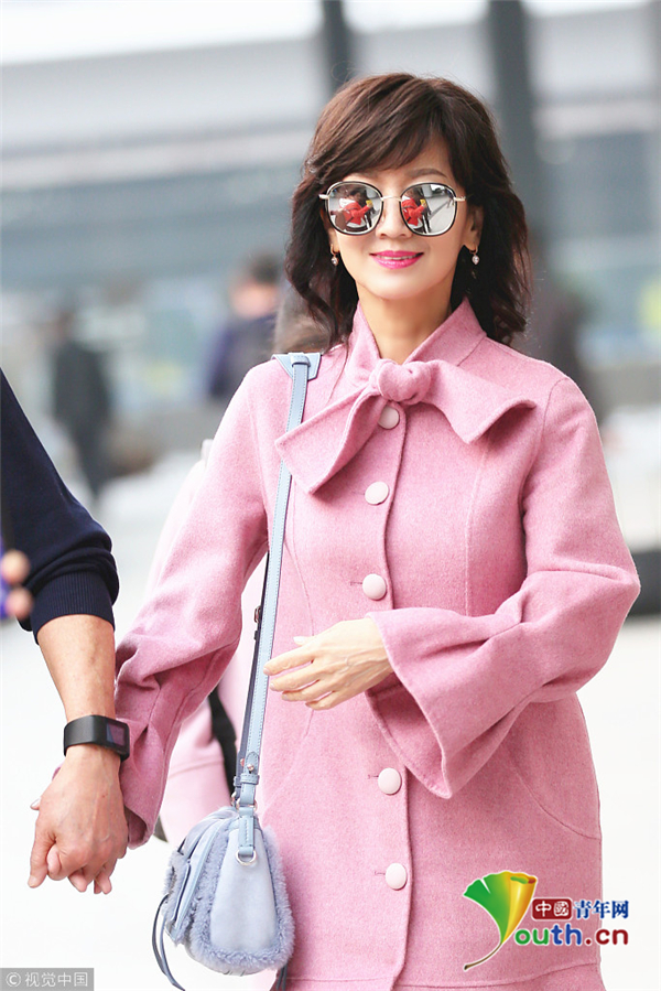 1月22日,廣東深圳,近日,趙雅芝與丈夫黃錦燊現(xiàn)身機場,黑超遮面的她身著粉色昵子魚尾大衣,氣質超群,一路獲粉絲跟隨,共先生黃錦燊牽手同行。