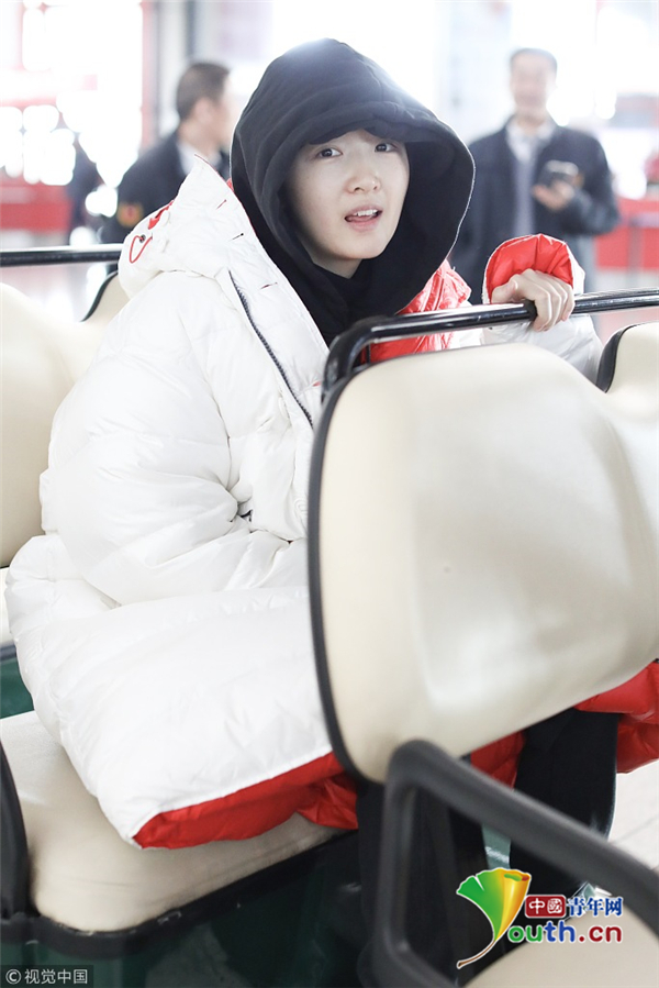 1月23日,北京,周冬雨現(xiàn)身機(jī)場。她用黑色連衣帽罩頭襯托巴掌臉,把下巴擱在行李車推桿上的雙手上呆萌可愛 。