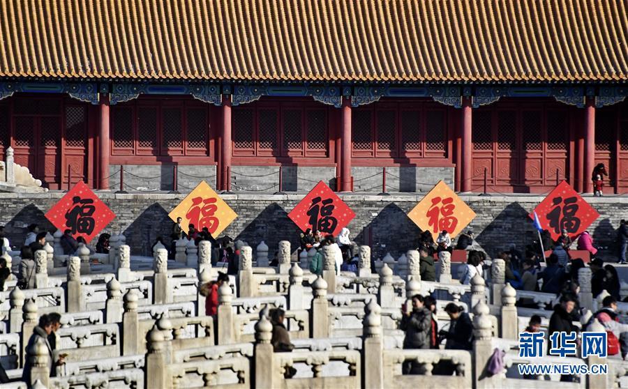 1月25日,游人在故宮內(nèi)的“五福”前留影。 春節(jié)將至,北京故宮博物院內(nèi)張燈結(jié)彩,到處懸掛著宮燈、萬壽燈、年畫、門神、福字等古代宮廷節(jié)日裝飾品,讓來自國內(nèi)外的游人感受到濃濃的年味。 新華社記者 李欣攝