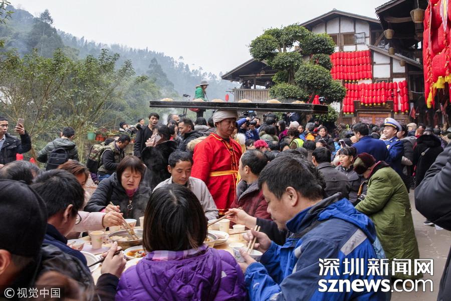 2019年1月26日,重慶中山古鎮(zhèn),880桌“千米長宴”5萬人共品年味。身著紅色對襟外套,光腳穿著草鞋的62歲老人楊光祥展示了他的絕活——“打盆上菜”。