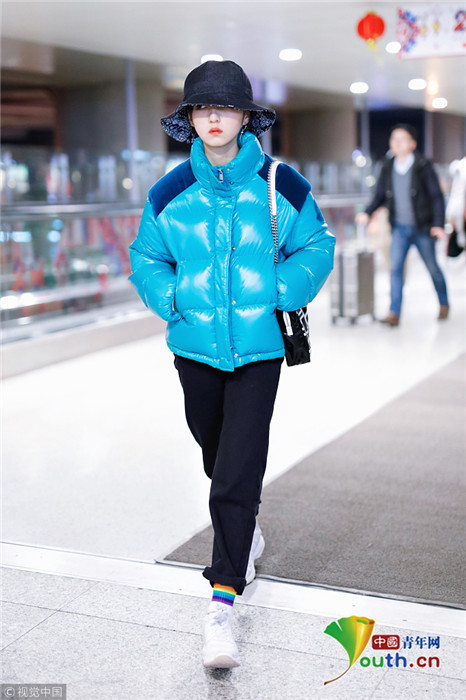 2019年1月31日,上海,張子楓現(xiàn)身機場。她身穿藍色羽絨服,戴著大檐帽也難擋好氣色,雪膚紅唇妝容精致展現(xiàn)女人味。