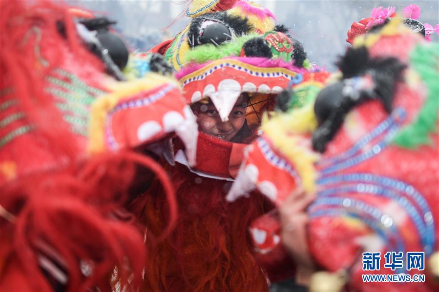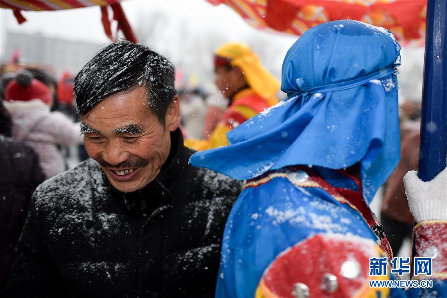 2月16日,群眾在青海省大通回族土族自治縣文化廣場冒雪觀看社火表演。新華社記者吳剛攝