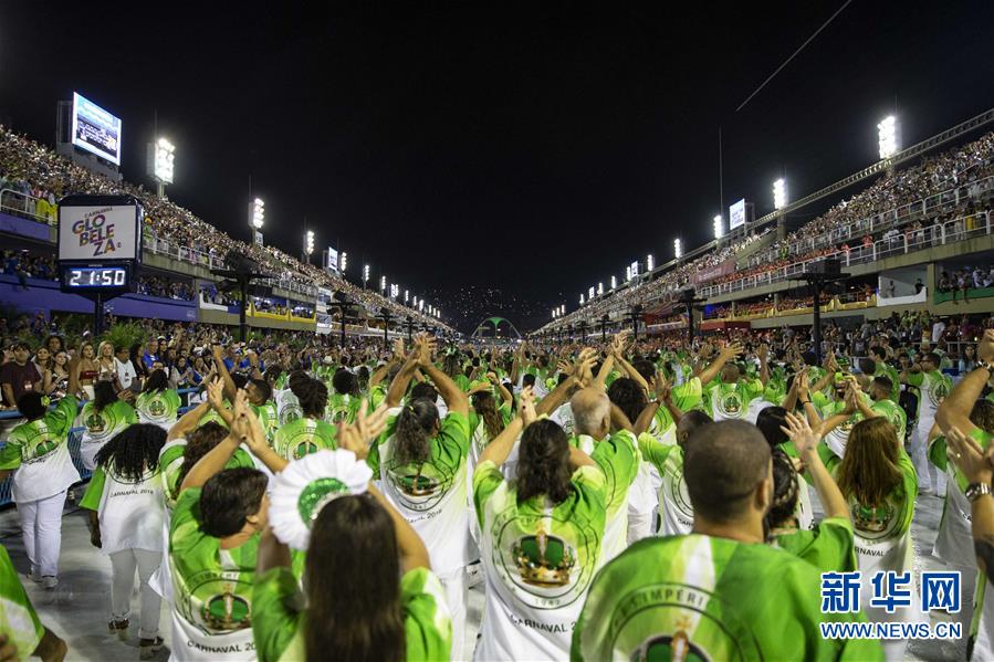 3月3日,在巴西里約熱內盧,特級組桑巴舞校工作人員參加狂歡節(jié)游行。 3月3日晚,2019年里約熱內盧狂歡節(jié)特級組桑巴舞校在桑巴大道開始花車巡游表演。 新華社記者李明攝
