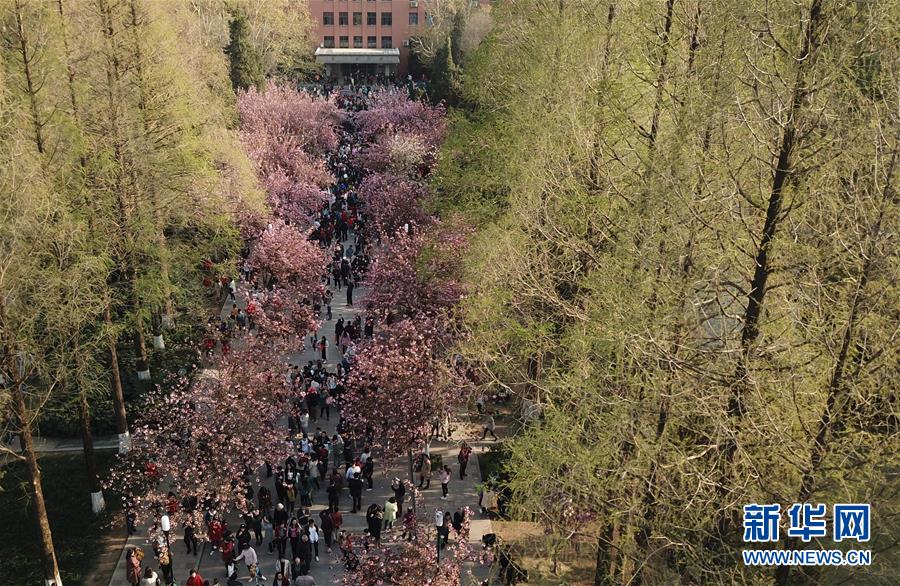 3月31日,游客在中國(guó)科學(xué)技術(shù)大學(xué)東區(qū)觀賞櫻花(無(wú)人機(jī)拍攝)。