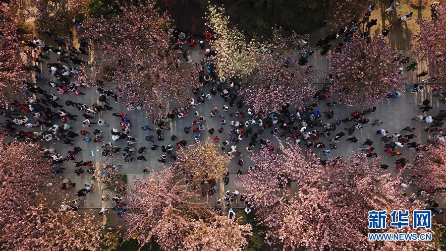 3月31日,游客在中國科學(xué)技術(shù)大學(xué)東區(qū)觀賞櫻花(無人機拍攝)。