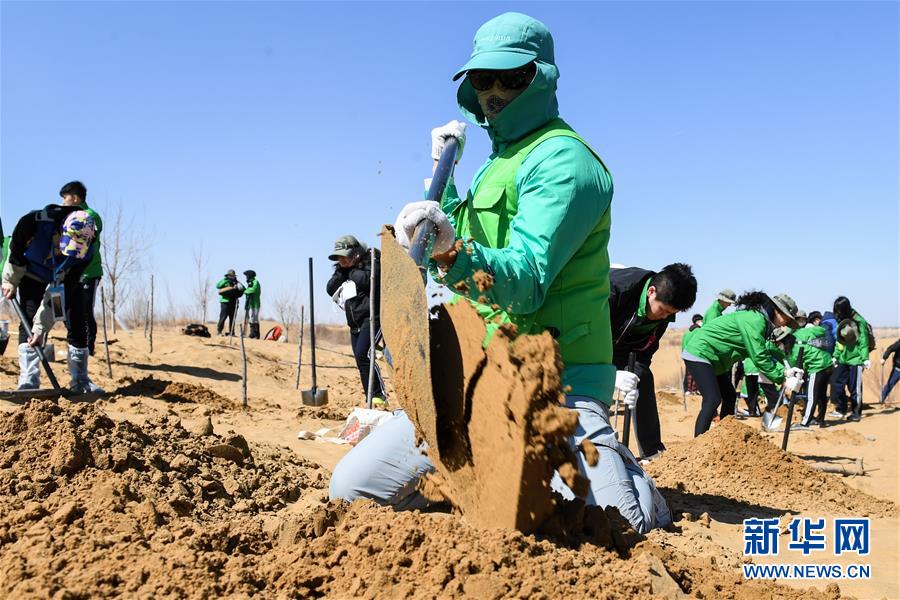 3月31日,參與植樹活動的青年志愿者在挖沙坑。 當日,200余名中韓兩國青年志愿者來到內(nèi)蒙古自治區(qū)達拉特旗庫布其沙漠種樹。2006年起,中國國際青年交流中心與韓國韓中文化青少年協(xié)會組織兩國青年志愿者在庫布其沙漠植樹,參與防沙固沙項目。截至目前已植樹850多萬株,造林3萬多畝。 新華社記者 劉磊 攝