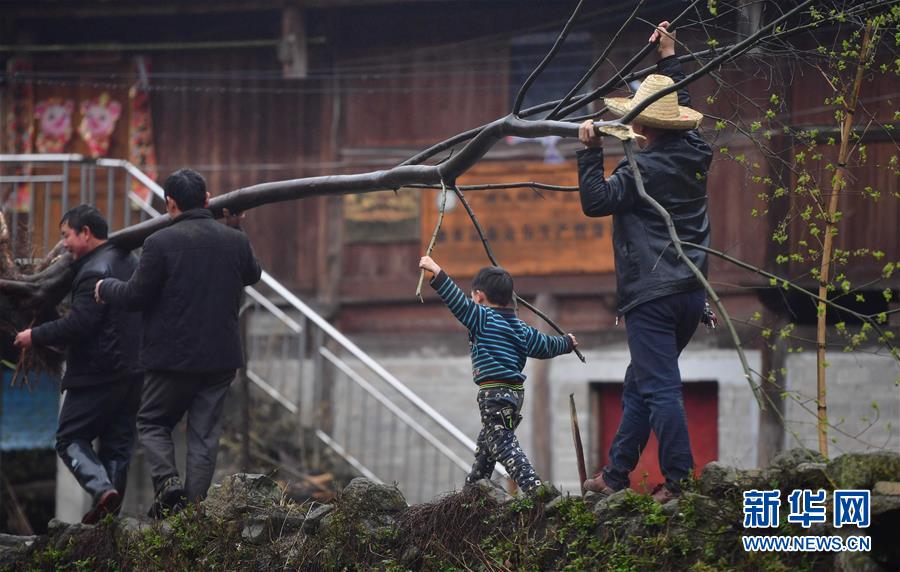 這是黔桂烏英苗寨的群眾在抬樹苗,準備用來美化居住環(huán)境(3月16日攝)。