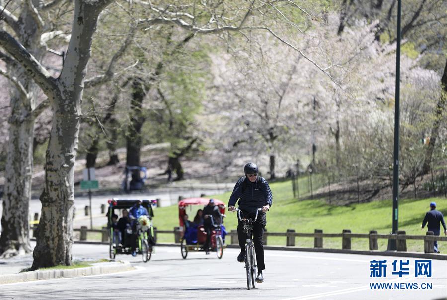4月16日,一名男子在美國紐約中央公園騎行。 新華社記者 王迎 攝