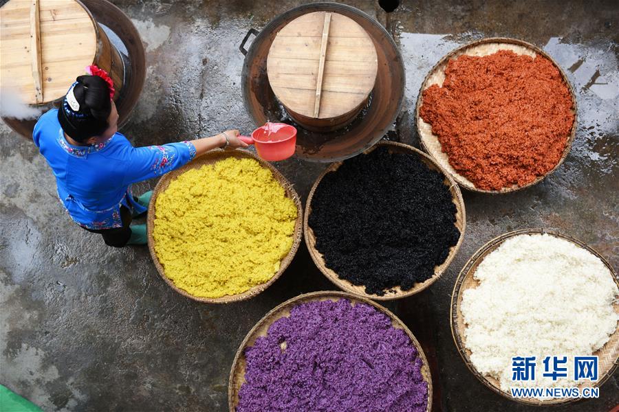 4月17日,在貴州省臺江縣姊妹街哆蝶五彩姊妹飯?bào)w驗(yàn)店,苗家婦女在蒸煮五彩“姊妹飯”。新華社記者 楊文斌 攝