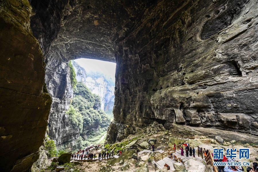 游客在天生三橋景區(qū)內(nèi)的天龍橋景點(diǎn)游覽(3月27日攝)。 隨著天氣轉(zhuǎn)暖,重慶武隆天生三橋景區(qū)風(fēng)景如畫(huà),氣勢(shì)磅礴的天生石橋和綠意盎然的山林相映成趣,吸引眾多游客前來(lái)踏春賞景。 新華社記者劉潺攝