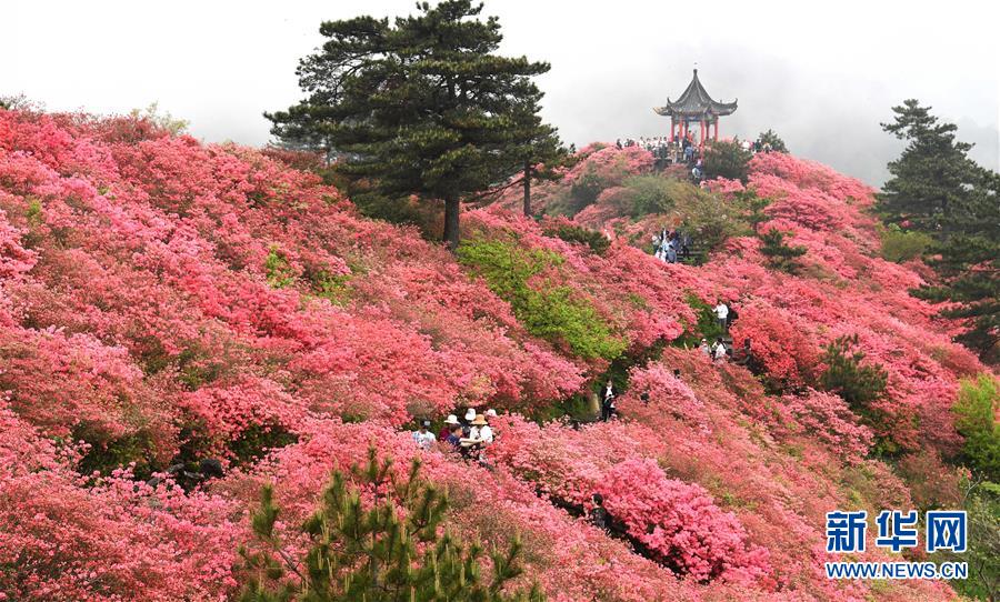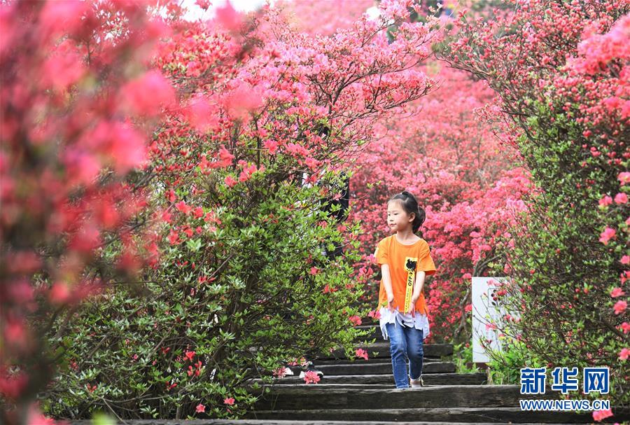 4月25日,游客在龜峰山杜鵑花海中游玩。 近日,湖北省麻城市龜峰山的10萬(wàn)畝古杜鵑盛開(kāi),大量游客前來(lái)賞花觀景。 新華社記者 程敏 攝