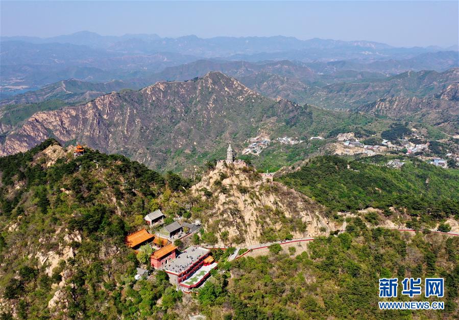 定光佛舍利塔矗立在盤山主峰掛月峰上(5月2日無(wú)人機(jī)攝)。新華社記者 岳月偉 攝