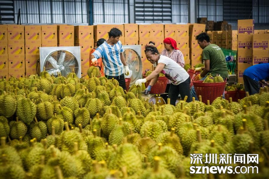 2018年4月20日晚上11點(diǎn),泰國尖竹汶府的金枕頭榴蓮分裝廠區(qū)內(nèi)燈火通明,工人們正在對剛摘下來的20多噸榴蓮打包、稱重。
