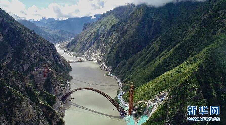 9月28日無人機拍攝的川藏鐵路拉林段重點標志性工程藏木特大橋。當日,隨著最后一節(jié)鋼管拱的對位和鎖定完畢,川藏鐵路拉林段藏木特大橋成功合龍,標志著大橋主體結構施工取得了關鍵性勝利。藏木特大橋由中國中鐵廣州局集團承建,拱高112米,橋橫跨雅魯藏布江峽谷,水深66米。新華社記者普布扎西攝