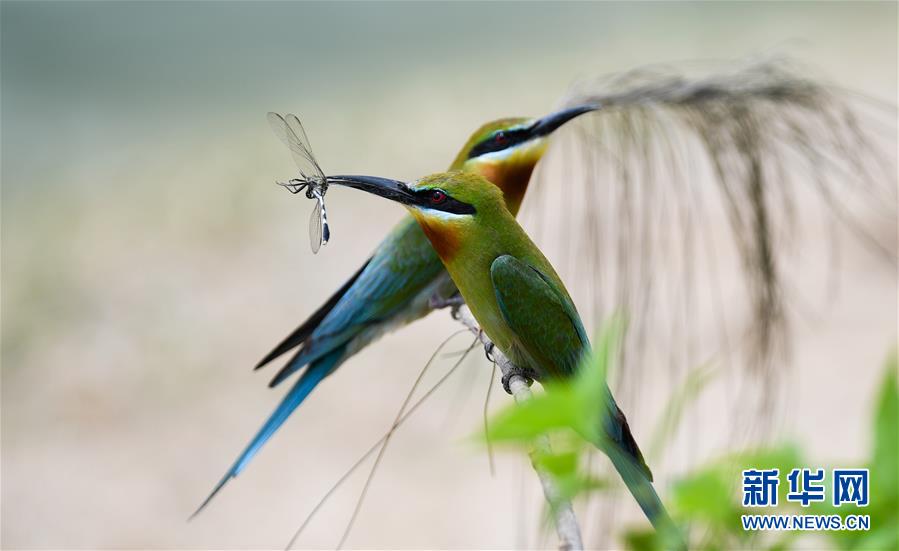5月14日,栗喉蜂虎在枝頭進食。 新華社記者 楊冠宇 攝